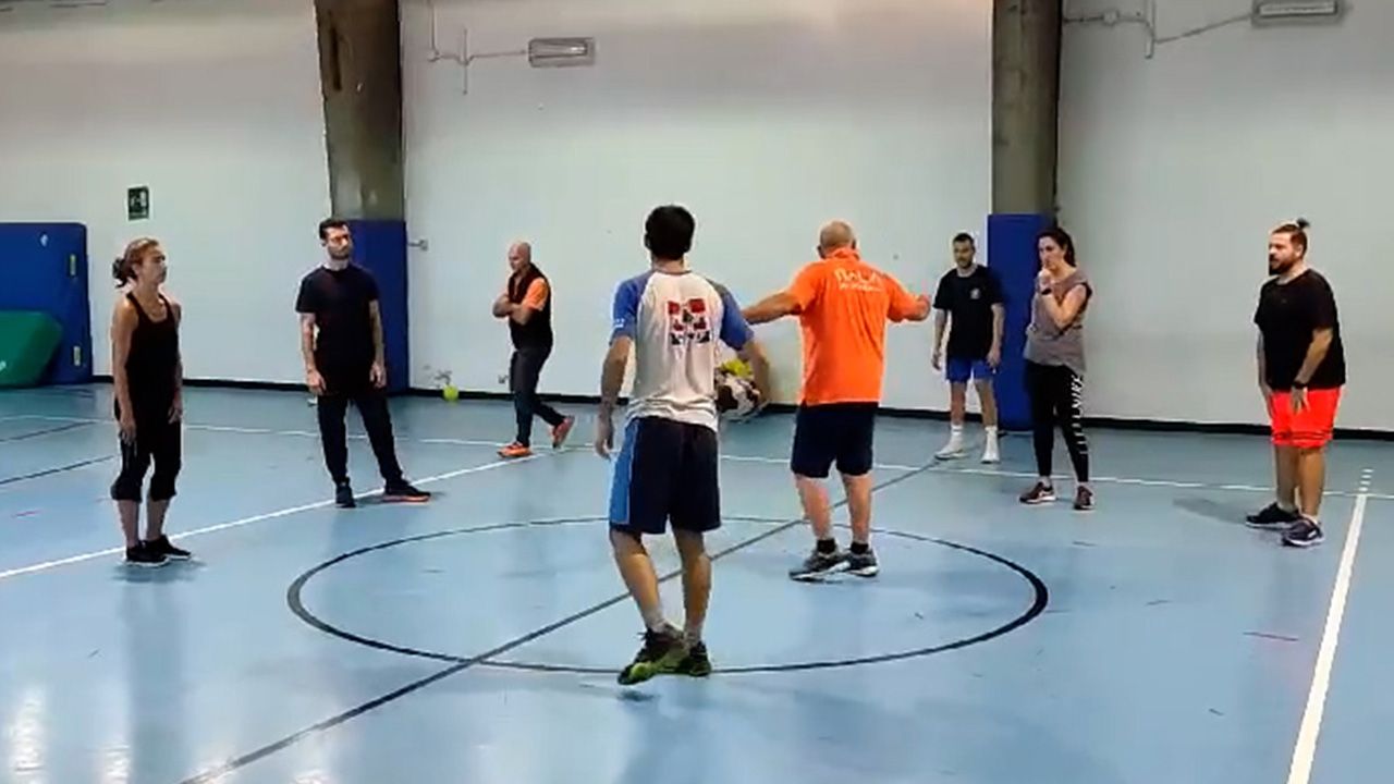 Description: Simplified match. The playing field is divided into three zones. Only the goalkeeper can play in the two outer zones, while the central zone is where offenders and defenders play. Foc…